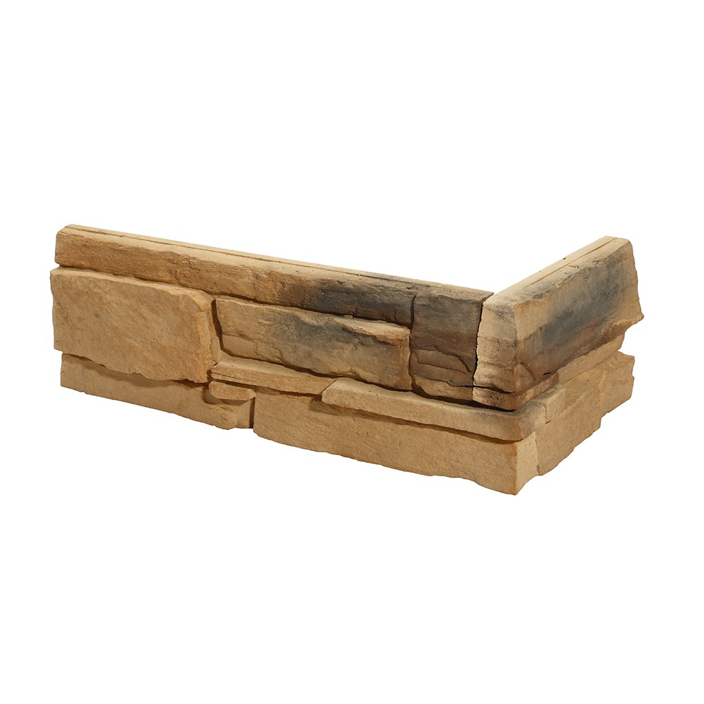 Betonový rohový obklad GRENADA 3 v hnědém odstínu kamene. Doplňkový rohový díl vytváří přirozené napojení obkladu na vnější roh. Vhodný pro interiér i exteriér, bez spárování.